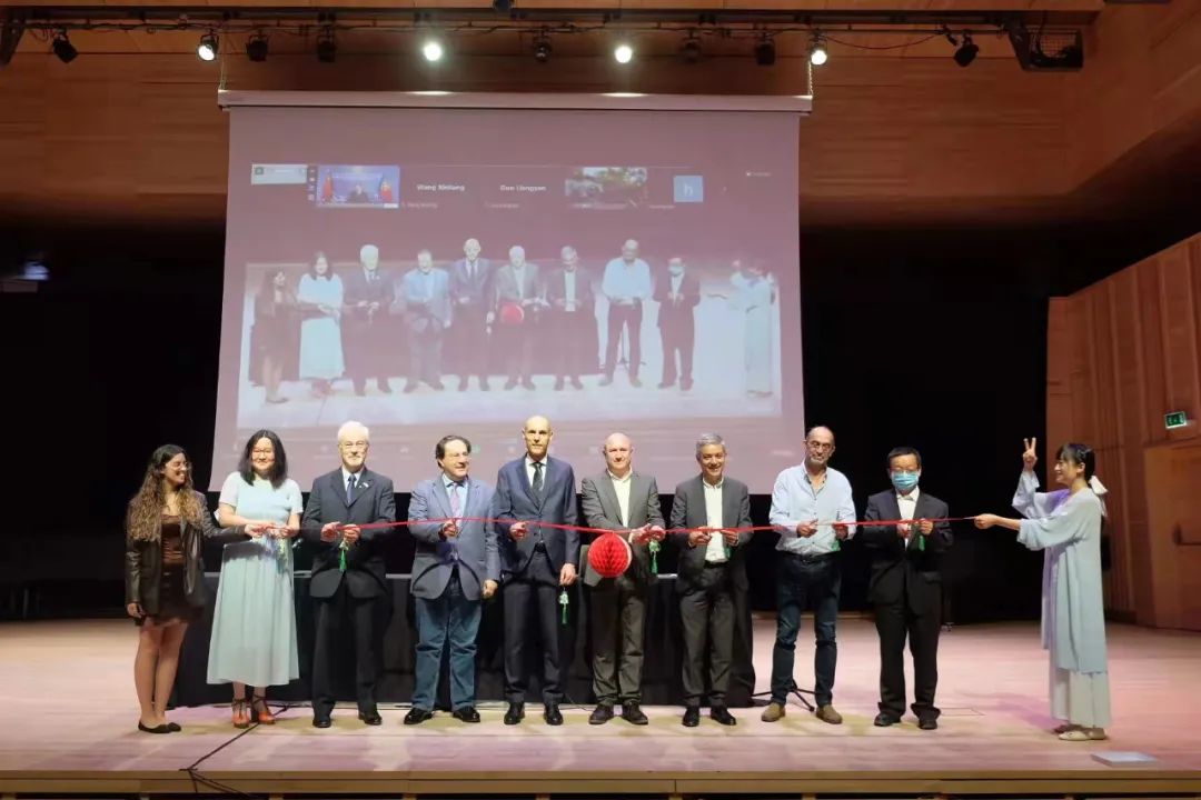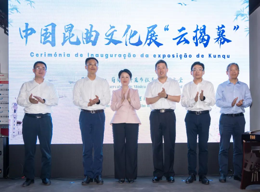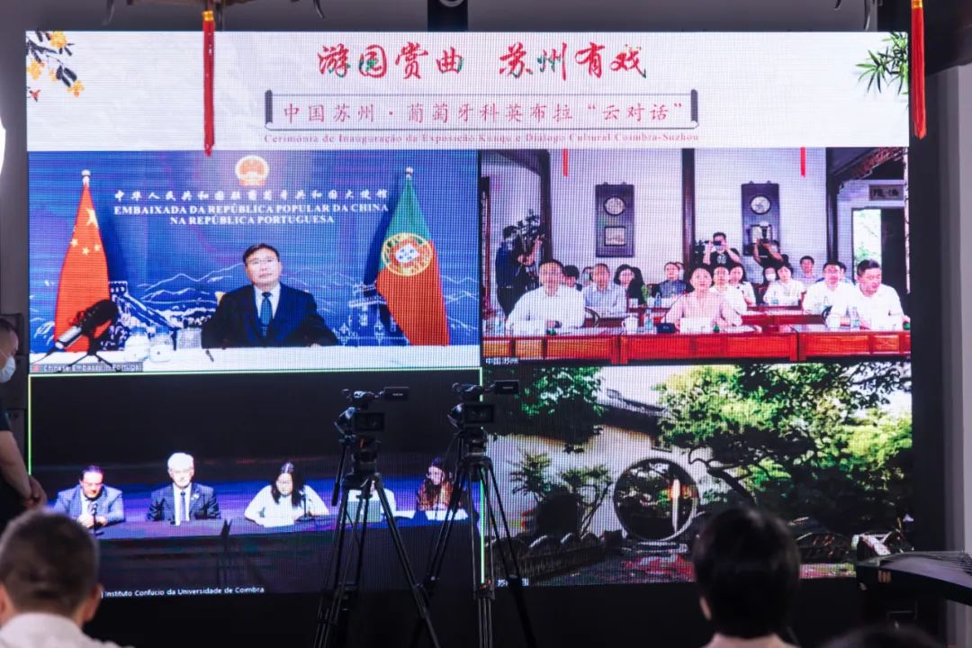 致辞结束后,在赵本堂大使的见证下,科英布拉市嘉宾为“中国昆曲文化展”剪彩开幕,该展览将在科英布拉音乐学院礼堂展出两个月。苏州市领导在东园明轩为展览“云揭幕”。揭幕仪式上,中葡嘉宾共同欣赏园林实景版昆曲《牡丹亭·游园惊梦》片段,聆听昆曲历史文化的介绍。
