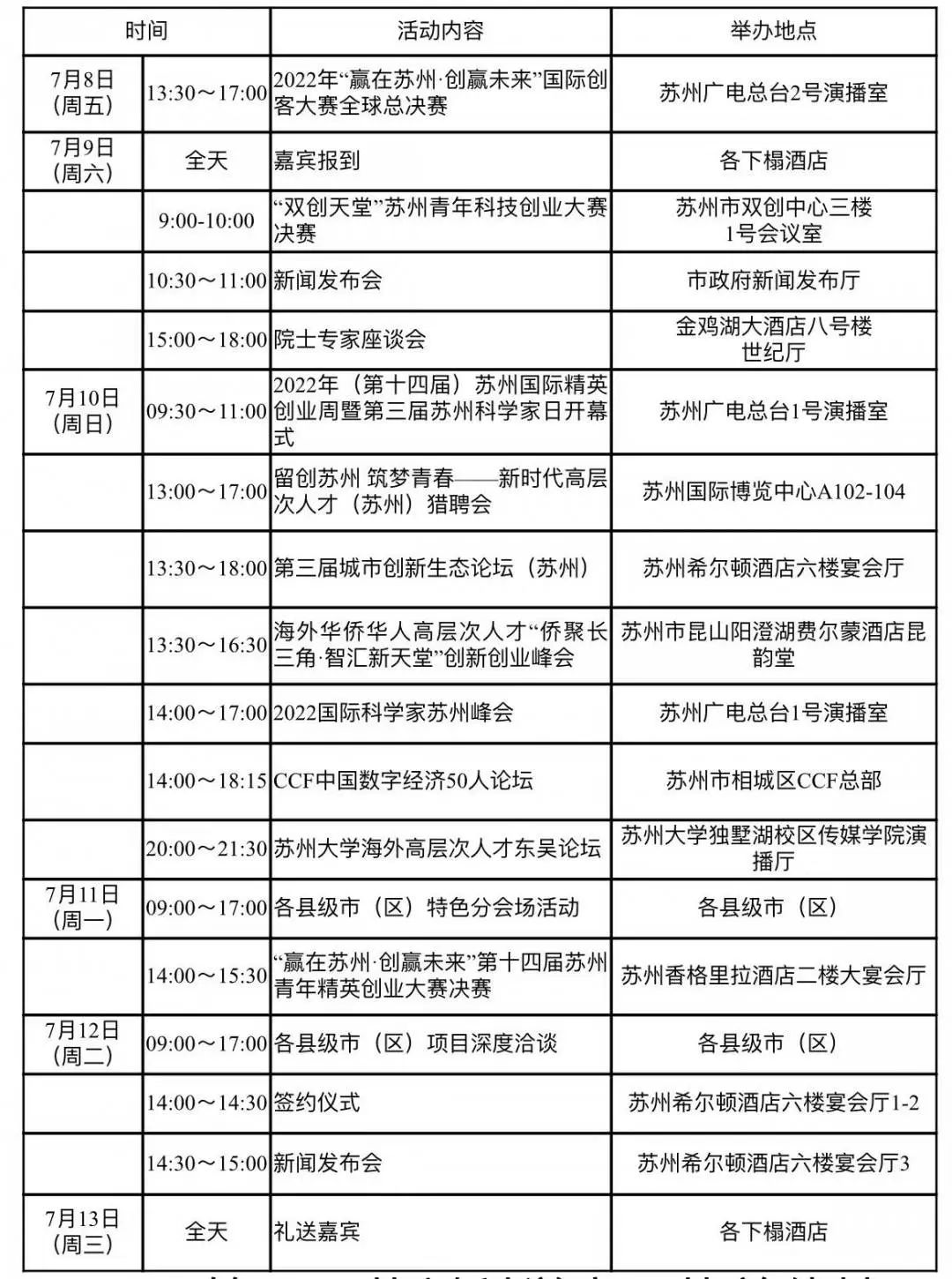 2022年(第十四届)苏州国际精英创业周于7月10日至12日举办,持续以“汇聚全球智慧、打造创业天堂”为主题,共设置主会场开幕式、分会场活动、分项活动三大类内容,其中主会场开幕式与第三届苏州科学家日结合进行。