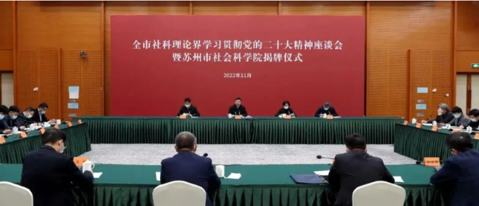 市委书记曹路宝在会上讲话,并为苏州市社会科学院揭牌。他强调,要深入学习宣传贯彻党的二十大精神,在加强习近平新时代中国特色社会主义思想的学习研究阐释中走在前、作表率,在谋划推进中国式现代化苏州新实践中勇担当、善作为,在加强和改善党对哲学社会科学领导上出实招、求实效,为推动苏州高质量发展贡献更多社科力量。