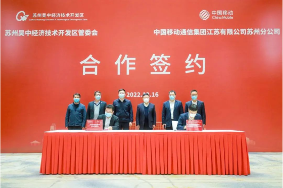 12月16日苏州吴中经济技术开发区管委会与中国移动通信集团江苏有限公司苏州分公司举行合作签约仪式,中国移动长三角(苏州)数字经济产业园项目落户吴中区。区委常委、经开区党工委副书记、管委会副主任徐积明;苏州移动公司总经理李宝祥等参加活动。
