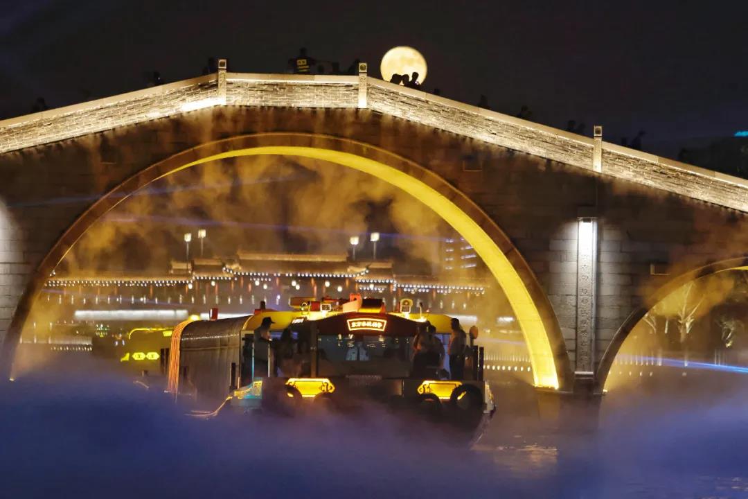 清风徐来,碧波荡漾。晚上6时50分许,各路嘉宾由觅渡桥码头登船,参加以姑苏韵味、精彩传承为基调的“行运夜姑苏”活动。沿途两岸分设“八角亭迎宾广场”“长亭晚照”“茶舍岸边”“水岸码头”“步道雅韵”“盘门码头”6个表演点,江南丝竹《姑苏行》、昆曲《游园·皂罗袍》、船歌《四季风光》、舞蹈《木刻春秋》、琴箫合奏《秋江夜泊》、苏剧《醉归》选段在各点分别上演。游船缓缓行进,船行水上,而陆上笙歌不绝,水陆联动,光影交错,串联起苏州市拥有的世界级、国家级的非遗项目和极具江南文化特性的“苏州戏曲”“苏式舞蹈”等内容,千年姑苏独具风韵的运河文化一览无余。