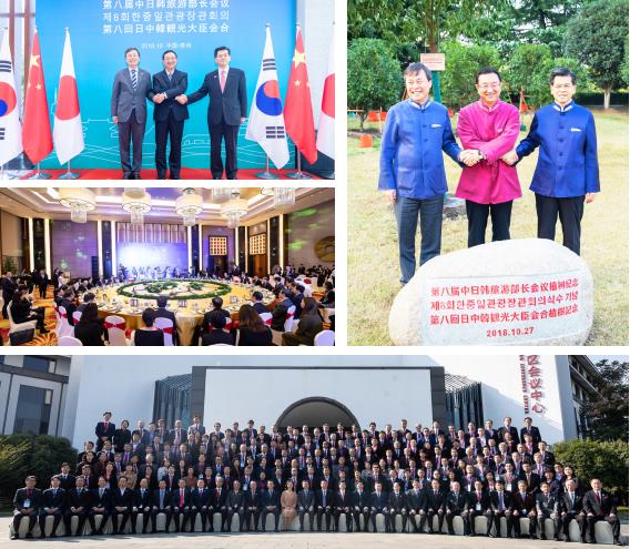 2018 年 10 月 27 日,第八届中日韩旅游部长会议在江苏省苏州市召开。中国 文化和旅游部部长雒树刚、韩国文化体育观光部长官都钟焕、日本国土交通大臣 石井启一共同出席会议并发表主旨演讲。 会议上,三国旅游部长围绕“旅游促进区域合作健康、稳定和可持续发展” 主题,共同回顾、肯定了中日韩旅游交流与合作的发展历程与成果,展望了三国 旅游合作发展的重点和总体方向,并共同发表《第八届中日韩旅游部长会议苏州 宣言》,明确了未来三国文化旅游合作的框架内容及目标方向,就进一步深化三 国旅游交流合作达成共识。